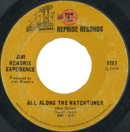 The Jimi Hendrix Experience began to record their cover version of Dylan's "All Along the Watchtower" on January 21, 1968, at Olympic Studios in London. According to engineer Andy Johns, Jimi Hendrix had been given a tape of Dylan’s recording by publicist Michael Goldstein, who worked for Dylan’s manager Albert Grossman. "(Hendrix) came in with these Dylan tapes and we all heard them for the first time in the studio”, recalled Johns.[20] According to Hendrix’s regular engineer Eddie Kramer, the guitarist cut a large number of takes on the first day, shouting chord changes at Dave Mason who had appeared at the session and played guitar. Halfway through the session, bass player Noel Redding became dissatisfied with the proceedings and left. Mason then took over on bass. According to Kramer, the final bass part was played by Hendrix himself.[20] Kramer and Chas Chandler mixed the first version of "All Along The Watchtower" on January 26, but Hendrix was quickly dissatisfied with the result and went on re-recording and overdubbing guitar parts during June, July, and August at the Record Plant studio in New York. Engineer Tony Bongiovi has described Hendrix becoming increasingly dissatisfied as the song progressed, overdubbing more and more guitar parts, moving the master tape from a four-track to a twelve-track to a sixteen-track machine. Bongiovi recalled, "Recording these new ideas meant he would have to erase something. In the weeks prior to the mixing, we had already recorded a number of overdubs, wiping track after track. [Hendrix] kept saying, ‘I think I hear it a little bit differently.’” The finished version was released on the album Electric Ladyland in September 1968. The single reached number five in the British charts, and number 20 on the Billboard chart, Hendrix's only top 20 / top 40 entry there.[23] The song also had the #5 spot on Guitar World's 100 Greatest Guitar Solos. Dylan has described his reaction to hearing Hendrix's version: "It overwhelmed me, really. He had such talent, he could find things inside a song and vigorously develop them. He found things that other people wouldn't think of finding in there. He probably improved upon it by the spaces he was using. I took license with the song from his version, actually, and continue to do it to this day."[25] In the booklet accompanying his Biograph album, Dylan said: "I liked Jimi Hendrix's record of this and ever since he died I've been doing it that way… Strange how when I sing it, I always feel it's a tribute to him in some kind of way." This version of the song appears at number 48 on Rolling Stone's 500 Greatest Songs of All Time,[26] and in 2000, British magazine Total Guitar named it top of the list of the greatest cover versions of all time. |